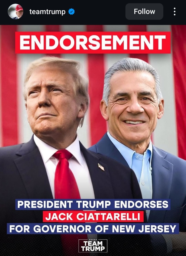 “Jack, who after getting to know and understand MAGA, has gone ALL IN, and is now 100% (PLUS). He is strongly supported by the most Highly Respected Leaders in New Jersey and, as your next Governor, Jack Ciattarelli will work closely with me and the Trump Administration to advance our American First Agenda.” (Truth Social)